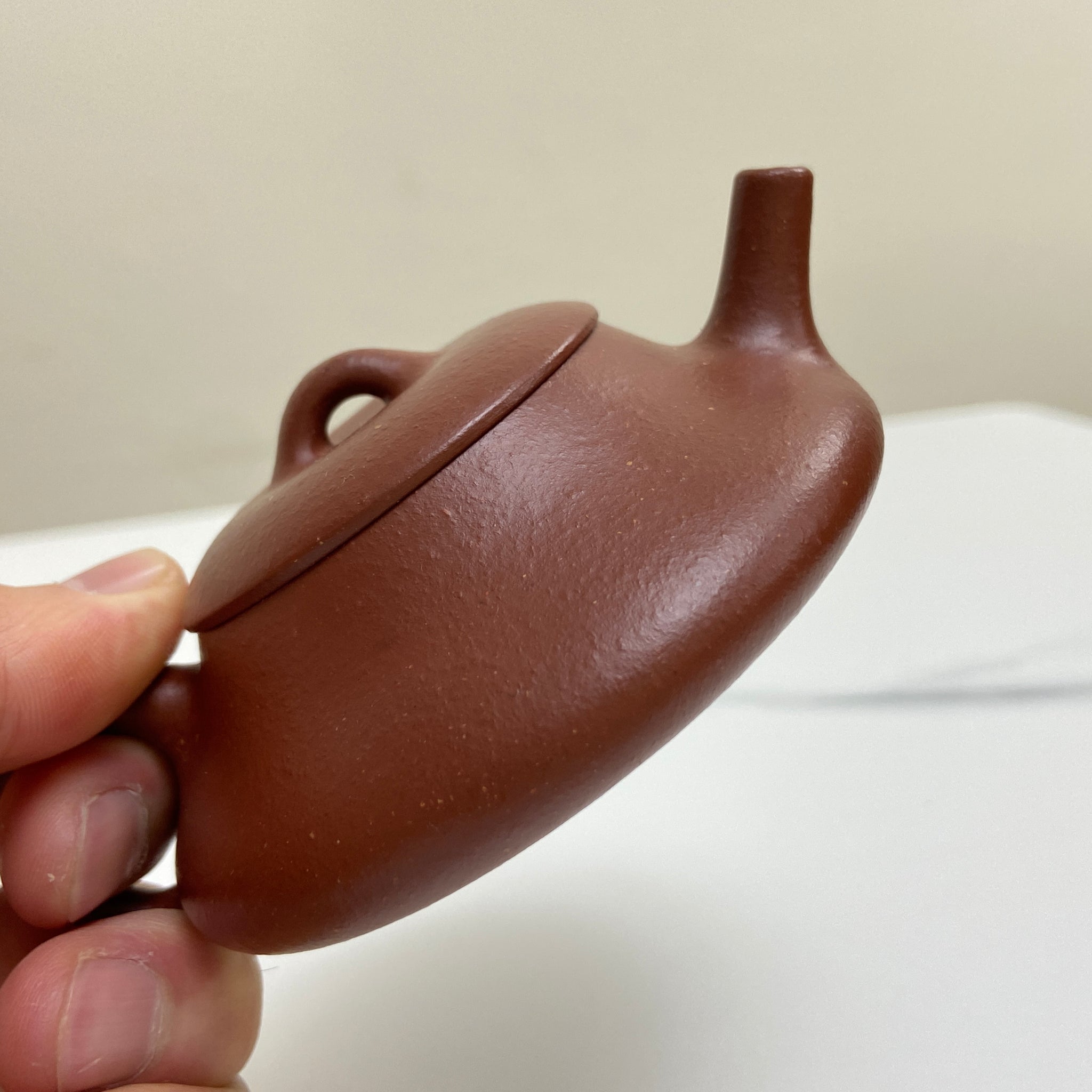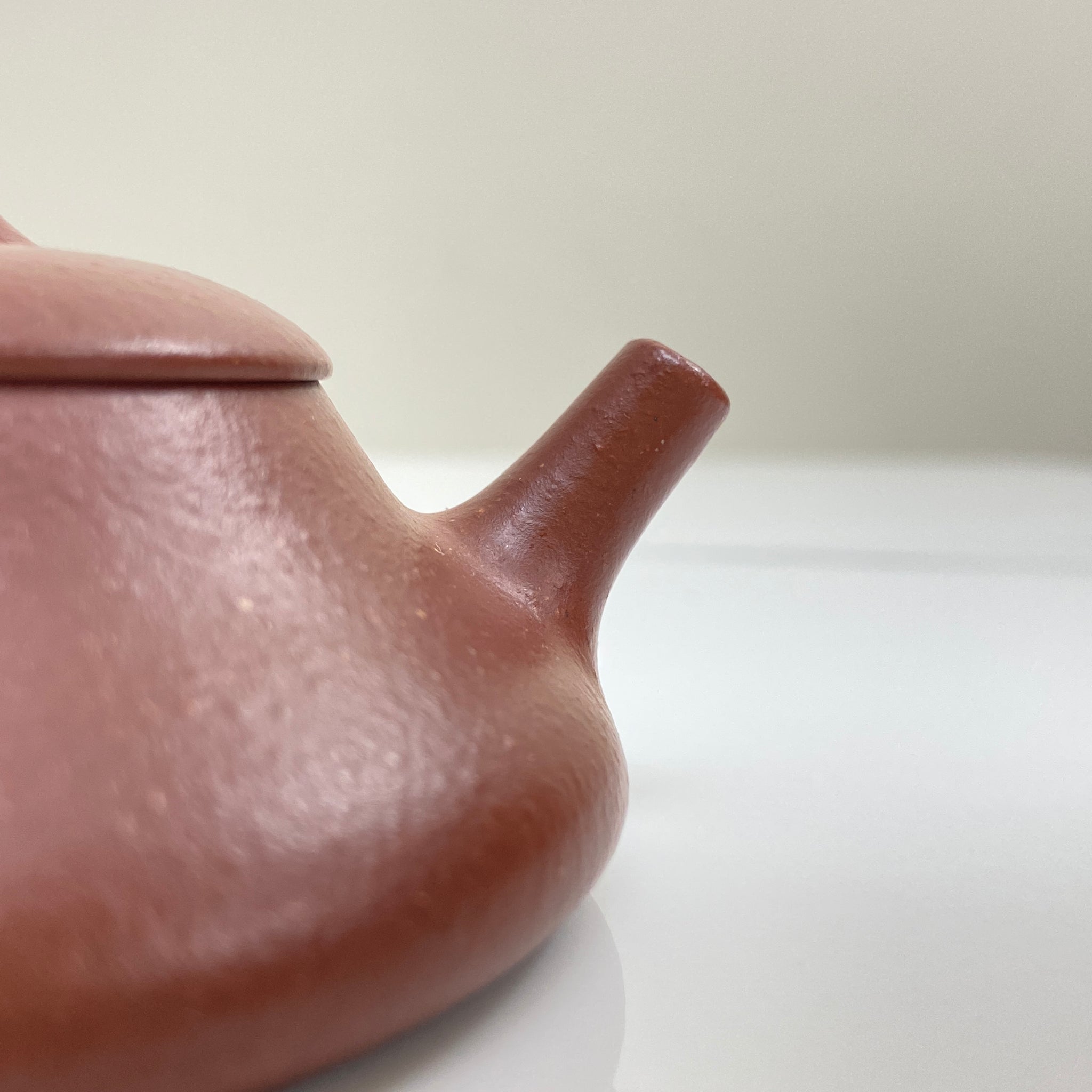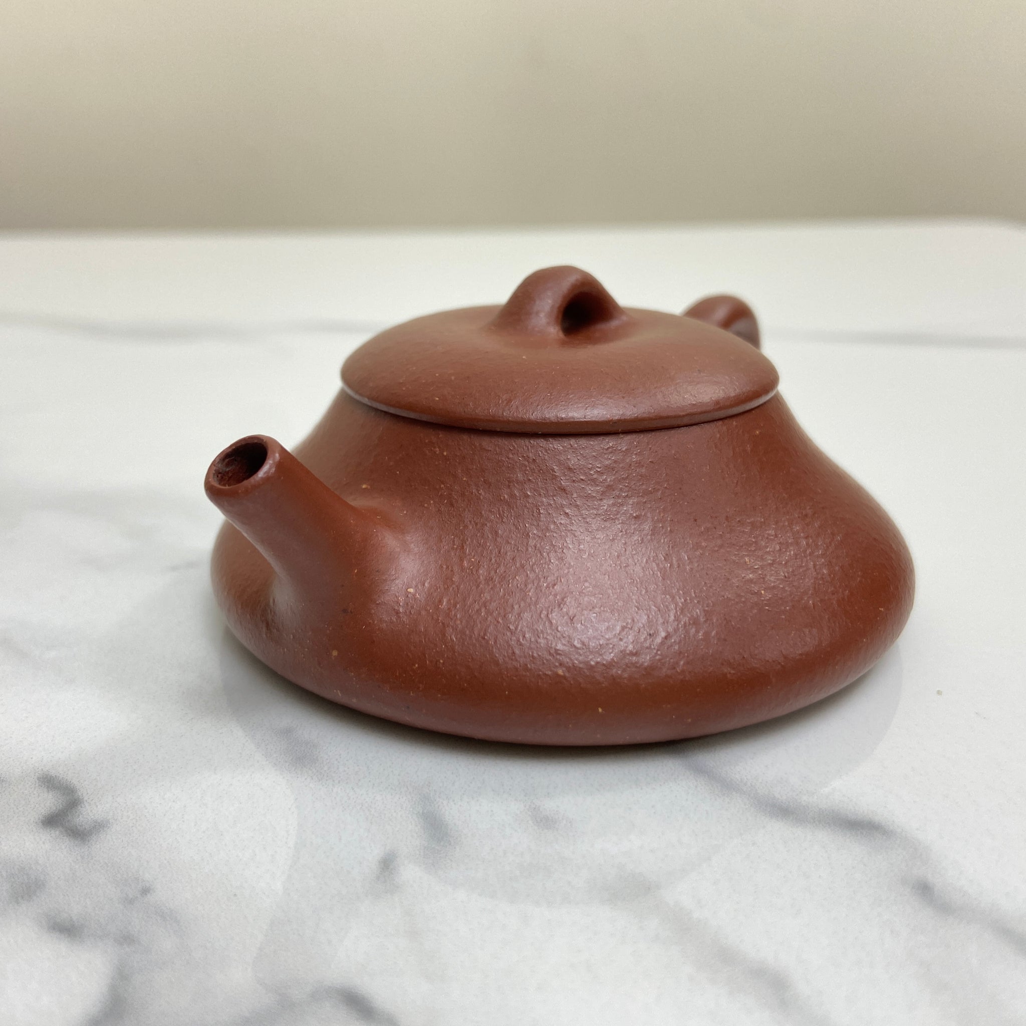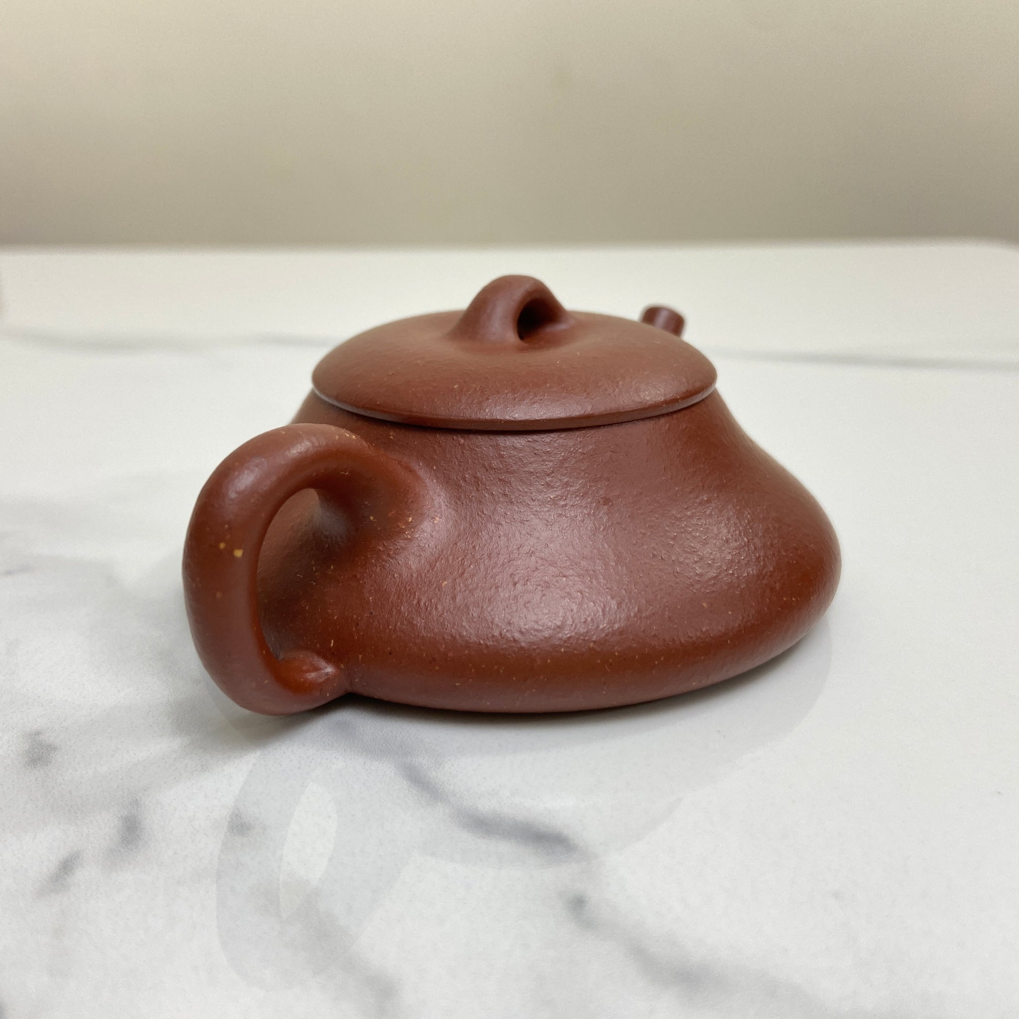 The Yin Piao is a geometric exercise in stability, featuring a significantly compressed vertical axis (4.0 cm) and a broad footprint. This low-profile architecture increases the surface area of the tea liquor relative to the air inside the vessel, facilitating specific thermal dissipation patterns. The Hong Jiang Po Ni from the Bao Shan region is a naturally occurring "blended" ore, which typically results in a variegated "pear skin" texture and excellent porosity. Technically, this clay's mineral composition—a mix of purple, red, and yellow clay components—provides a balanced environment for tea extraction, effectively softening the astringency of young puerh or intensifying the sweetness of medium-roasted oolongs. The 77ml capacity is calibrated for high-precision, small-batch brewing where controlled water-to-leaf ratios are paramount.