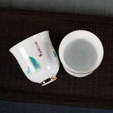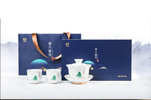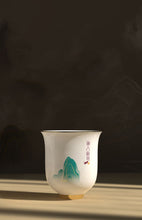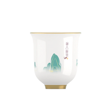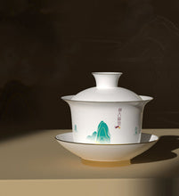 This high-quality white porcelain set, featuring a 150ml Gaiwan and two 75ml tea cups, is an epitome of elegance and tradition, designed for the Chinese Gongfu tea ceremony. The set is adorned with serene mountain motifs in varying shades of green, symbolizing the peaceful essence of nature and the high mountains where the finest teas are cultivated. The delicate gold trim adds a touch of sophistication, making this set a distinguished addition to any tea service.