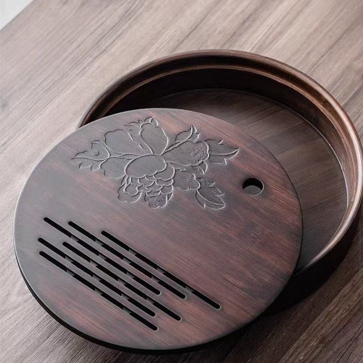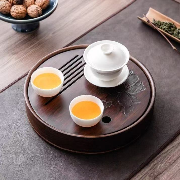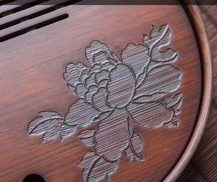 This Round Tea Tray is an exquisite piece of craftsmanship, designed for the ritual of Gongfu tea, a traditional Chinese method of tea preparation that focuses on the aesthetic presentation and sharing. The tray is constructed from high-quality bamboo, a material revered for its durability and natural beauty.
