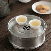 The image depicts a Tin Tea Tray, an integral component of Chaozhou Gongfu Teaware. Originating from Chaozhou, this piece is made from tin, a material known for its luster and durability. With a diameter of 16.5 cm and a height of 8 cm, this tray is designed to elegantly hold and present teaware, such as teapots and cups, during a Gongfu tea ceremony.