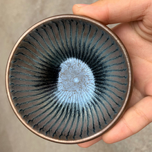 This tea cup, with a full capacity of approximately 125ml, stands out for its unique "Yin You Di" (Silver Oil Drip) glaze. The intricate pattern resembles a radial burst of silver droplets, an effect achieved through a meticulous glazing process that requires precision and a profound understanding of the materials. The 'jumping knife' aspect refers to the dynamic, almost explosive pattern within the glaze, giving the impression of motion frozen in time.